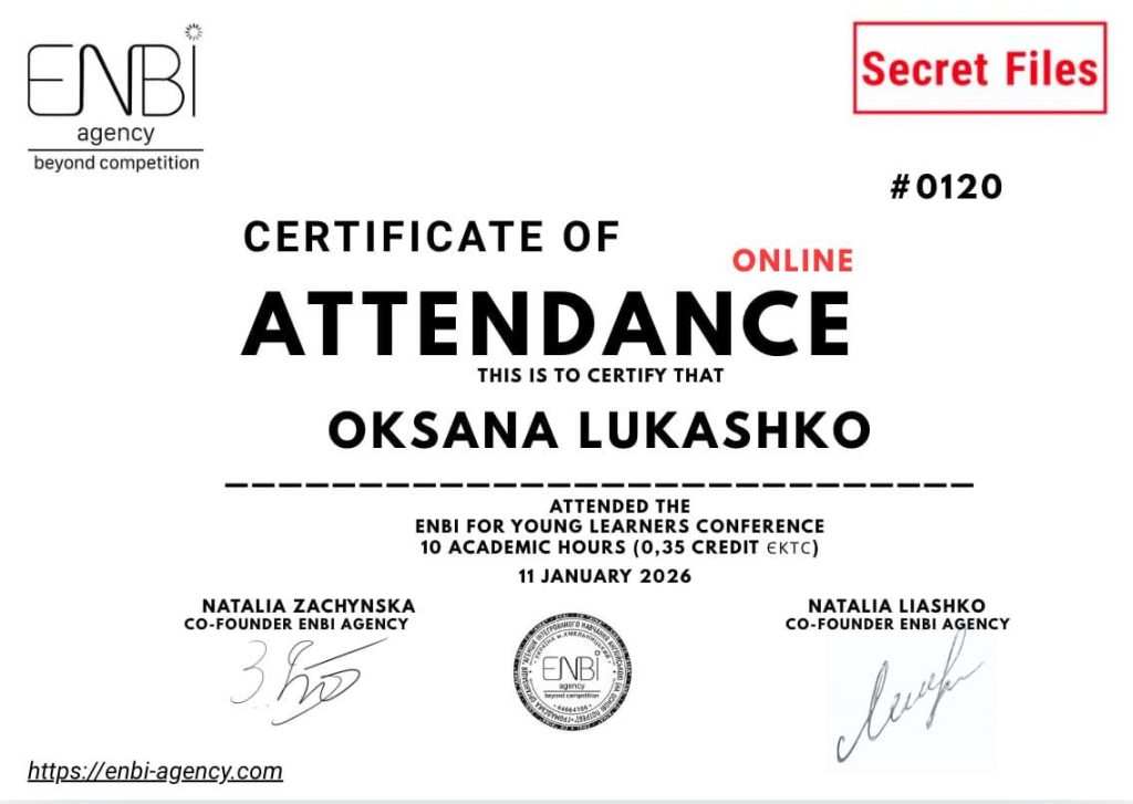 11 січня викладач англійської мови Оксана Лукашко взяла участь в онлайн-конференції «ENBI For Young Learners», що об’єднала найкращих спікерів України та світу. Захід став цінним професійним досвідом і джерелом нових методичних ідей у викладанні англійської. Учасники отримали сертифікати, навчальні матеріали та корисні поради від експертів. Викладачі коледжу й надалі активно вдосконалюють свої знання, доводячи, що навчання — це не про час, а про зусилля.